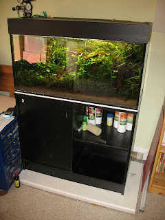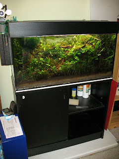 Es ist übrigens auch noch auf der linken Seite des Beckens ein Dennerle-Thermo Behälter für Bio Co2 Flaschen angeklebt, sodass man nur noch eine dieser im Handel erhältlichen Flaschen braucht und schon für besseren Pflanzenwuchs sorgen kann!