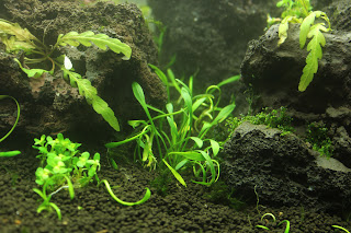 Der Großteil der Bepflanzung besteht aus Cryptocorine parva, die ich, wie es eben so üblich ist, in den Bodengrund um die Lavasteine herum eingesetzt habe.