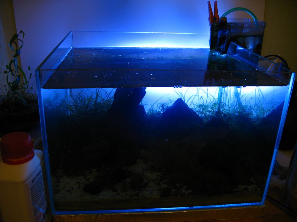 habe eben mal kurz mit einer Led-Taschenlampe rumgeleuchtet und natürlich auch ins Aquarium bzw. hinter diese geleuchtet.