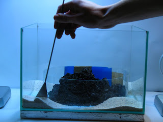 Damit ich des Streifes Plexiglas entfernen konnte, um mit dem Setzen der Steine zu beginnen, habe ich schonmal den Sand um die Mittelinsel eingestreut. Dieser begrenzt dann weiterhin das Aquasoil, damit sich der kleine Berg nicht einebnet:
