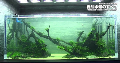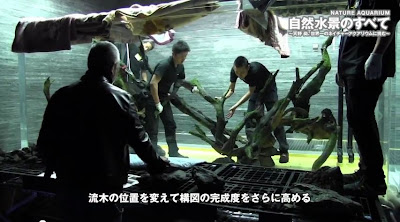Zuerst wurde das Hardscape gesetzt. Dabei agierte Amano dirigentenartig vor dem Aquarium, während seine Assistenten die mit Moos bepflanzten Wurzeln zentimetergenau platzierten.
