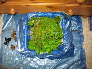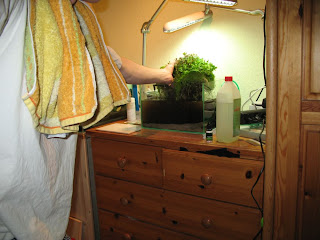 Dann etwas Wasser ablassen und den Pflanzenberg gegriffen. Da die Pflanzen extrem miteinander verwachsen waren, konnte man den kompletten Beckeninhalt mit einer Hand aus dem Aquarium holen: