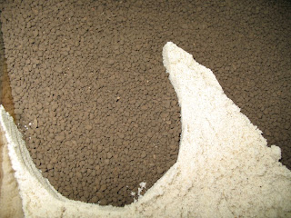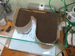 Heute habe ich dann erstmal das Becken richtig sauber gemacht und den Bodengrund eingebracht. Mit Hilfe eines Pappstreifens, habe ich eine geschwungene Barriere im Becken mit Tesafilmstreifen provisorisch eingeklebt, um eine saubere Trennung der vorgesehenen Böden zu gewährleisten. Zuerst wurde das gröbere Ada Aqua Soil eingebracht: