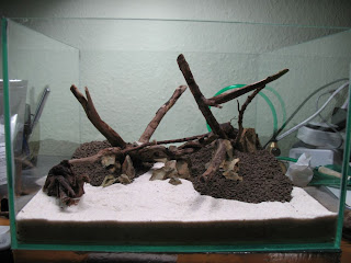Dann habe ich, bei dieser Hitze bestimmt 20 Minuten an den beiden neuen Wurzeln gesägt, um sie besser an das Becken anpassen zu können. Nun habe ich auch schon einen Platzierungsversuch gestartet. Zusammen mit den Wurzeln bilden einige Drachensteinbruchstücke das Hardscape.